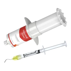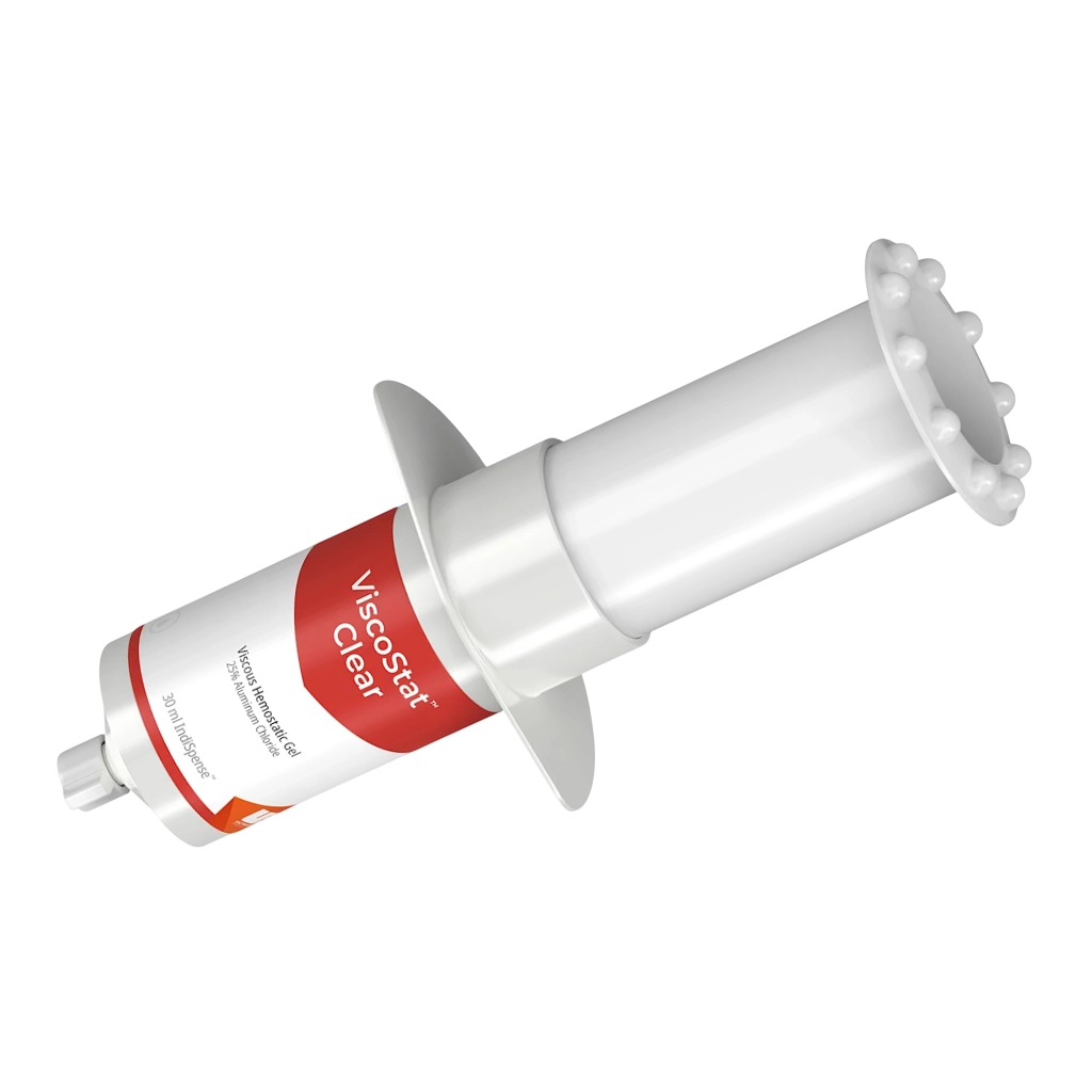 ViscoStat Clear es un gel hemostático viscoso de cloruro de aluminio al 25% recomendado para las restauraciones de los dientes anteriores, dado que elimina los sangrados leves sin dejar residuos. El uso de una punta Dento-Infusor Tip para frotar el gel sobre el tejido mejora en gran medida el efecto del cloruro de aluminio. A su vez, los hilos Ultrapak pueden presionarse directamente dentro del gel.